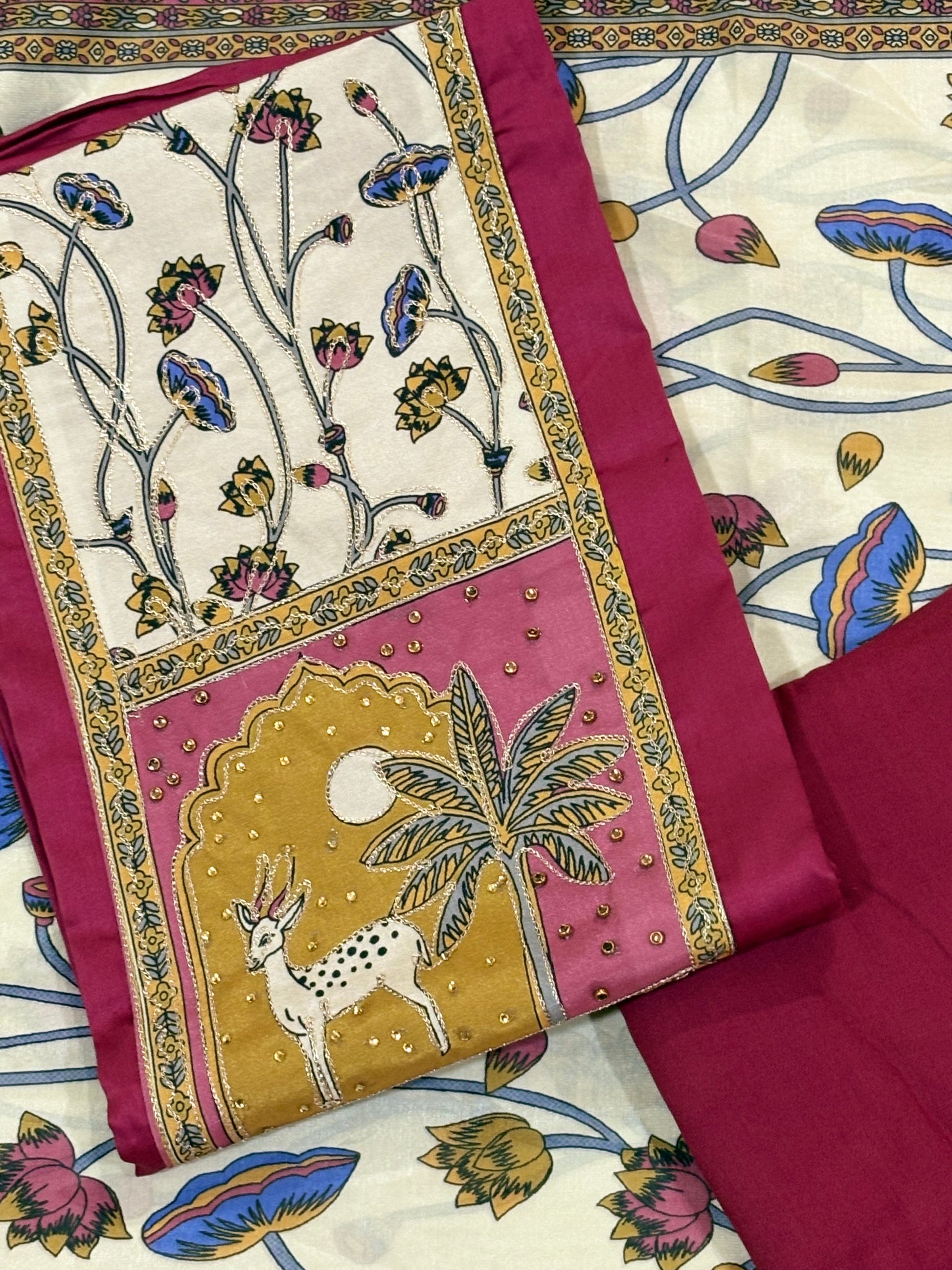 Onion Pink | Three Piece | Kalam Kari | Unstitched Cotton Suit Set